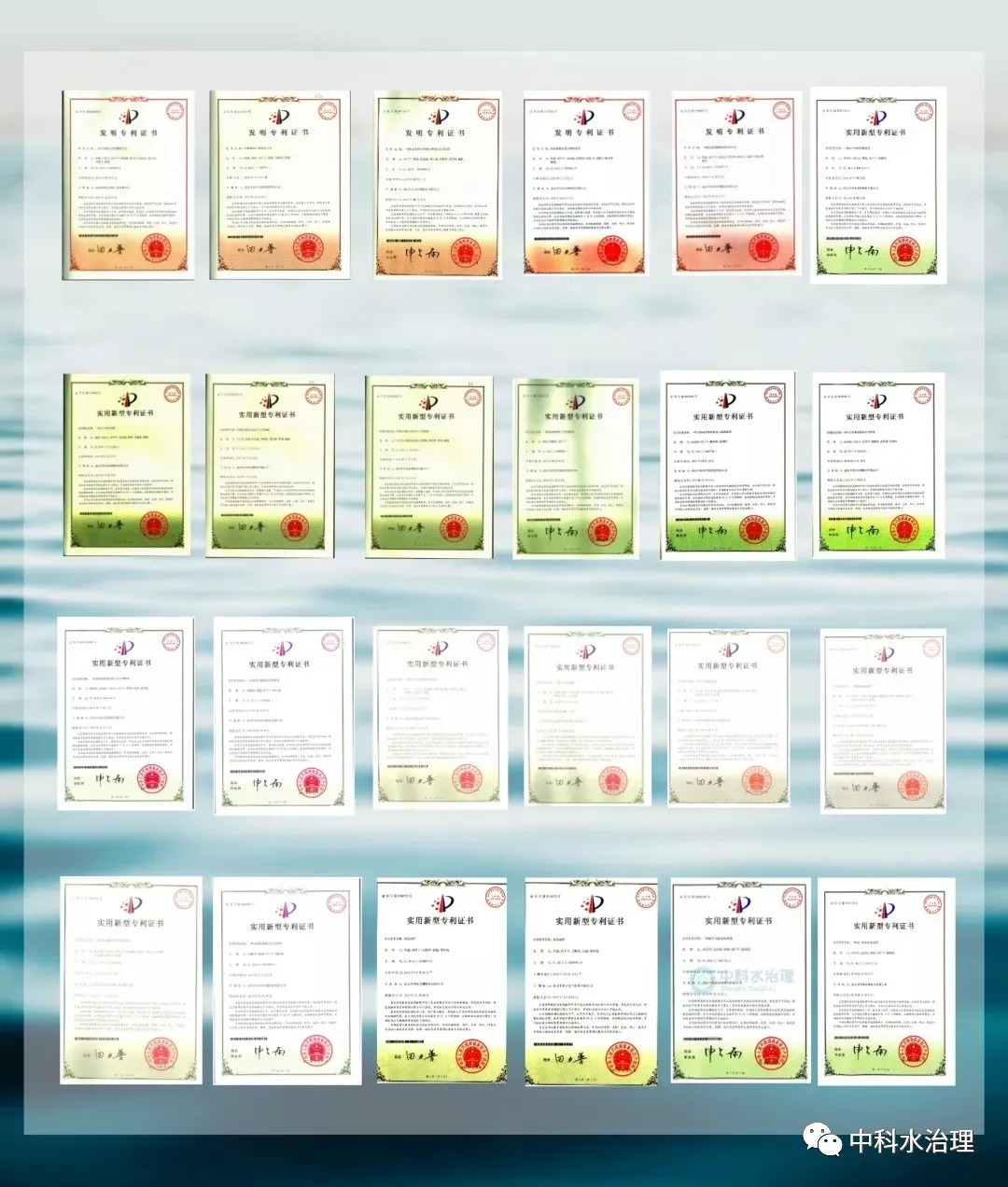 2011年,中科水治理獲得國(guó)家“高新技術(shù)企業(yè)”認(rèn)證,完成股份制改造,中科院成為公司第二大股東。上圖為公司獲得過(guò)的多項(xiàng)專利證書。