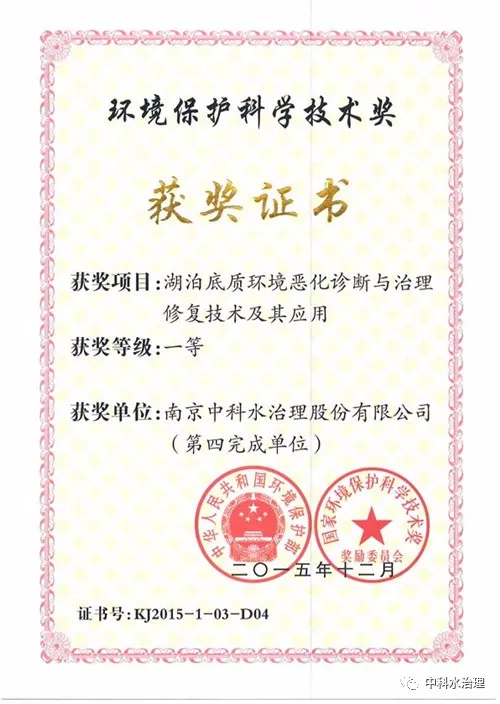 2015年,中科水治理技術(shù)獲得國(guó)家環(huán)保部頒發(fā)的環(huán)境保護(hù)科學(xué)技術(shù)一等獎(jiǎng)。