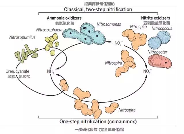 這個理論最先是由俄國微生物界傳奇維諾格拉斯基 (Sergei Winogradsky)早在19世紀末成功展示,他分離出了負責這兩步硝化的微生物,也就是所謂的AOB(ammonia oxidizing bacteria)NOB(nitrite oxidizing bacteria)。但這個超過100年歷史的教條在2015年圣誕節前被英國明星科學雜志《自然》上的兩篇同日發表的題目雷同的文章和隨后一篇在美國微生物學會的文章終結了。三個科學團隊發現了三種不同的培養[1,2]和一種非培養細菌[3]能夠各自進行從氨氮到硝態氮的完全硝化過程。