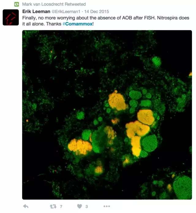 有了以上的鋪墊,你可能就對這些完全氨氧化菌的存在不再感到太過驚奇了,無論它是來自水生環境[1]、地下深處的管道[2]抑或是自來水處理廠的生物活性濾池[3]。而在目前發現的三個案例里,這種細菌都同屬一個屬Nitrospira (中文貌似叫硝化螺菌屬)。而在此之前,Nitrospira一直被認為只能氧化亞硝態氮成硝態氮。