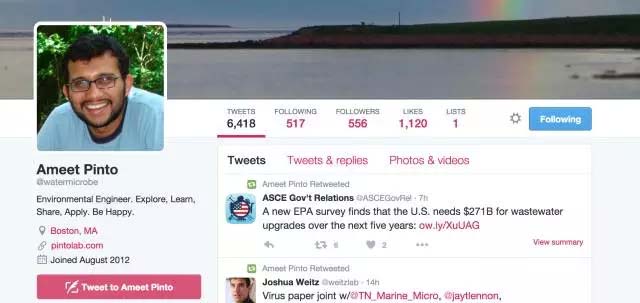 如果你的研究方向和他相似,盡可以跟他聯系,他的推特賬號是@watermicrobeemail a.pinto@neu.edu